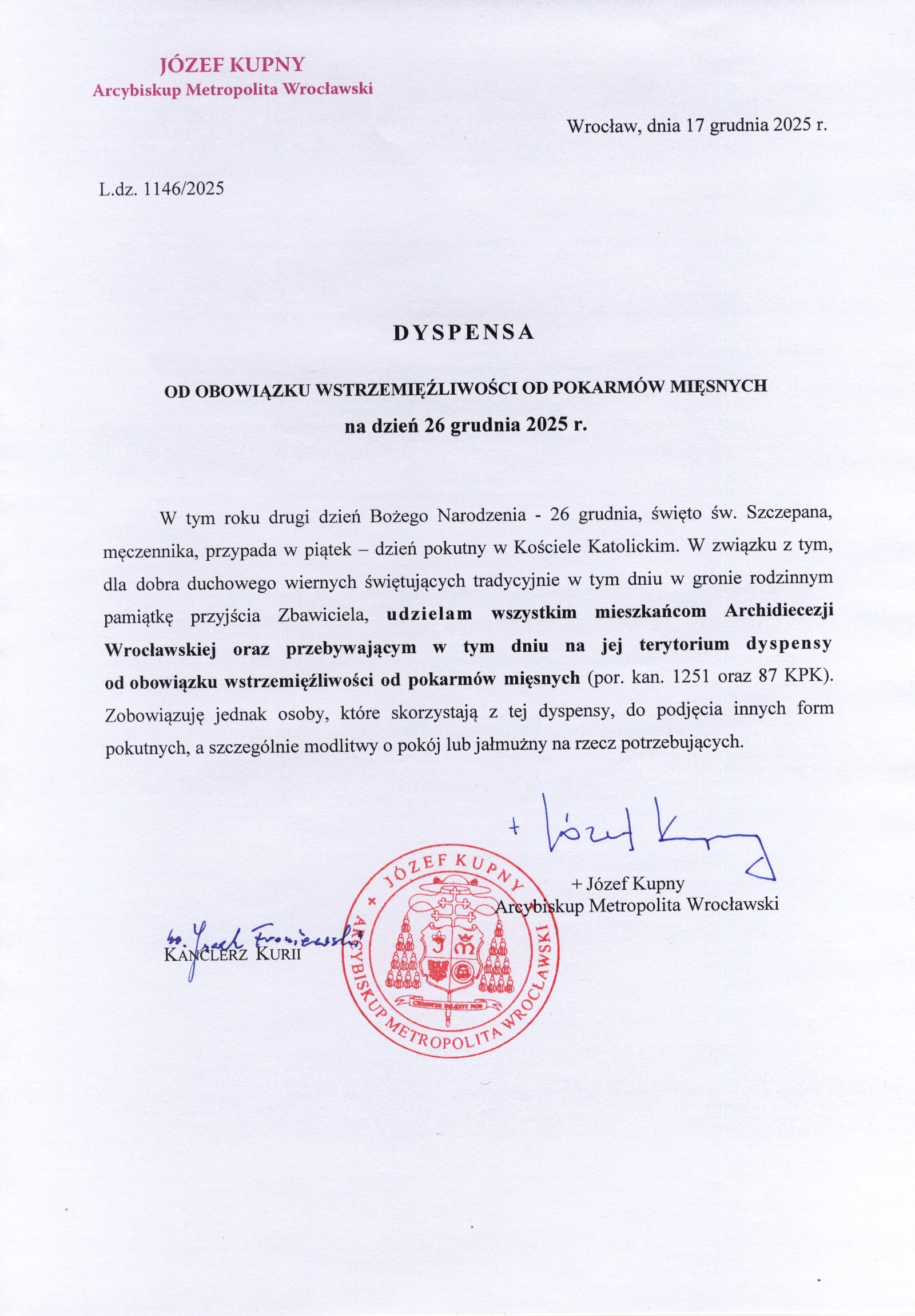Dyspensa od wstrzemięźliwości od pokarmów mięsnych w piątek 26 grudnia 2025 (grudzień 2025)